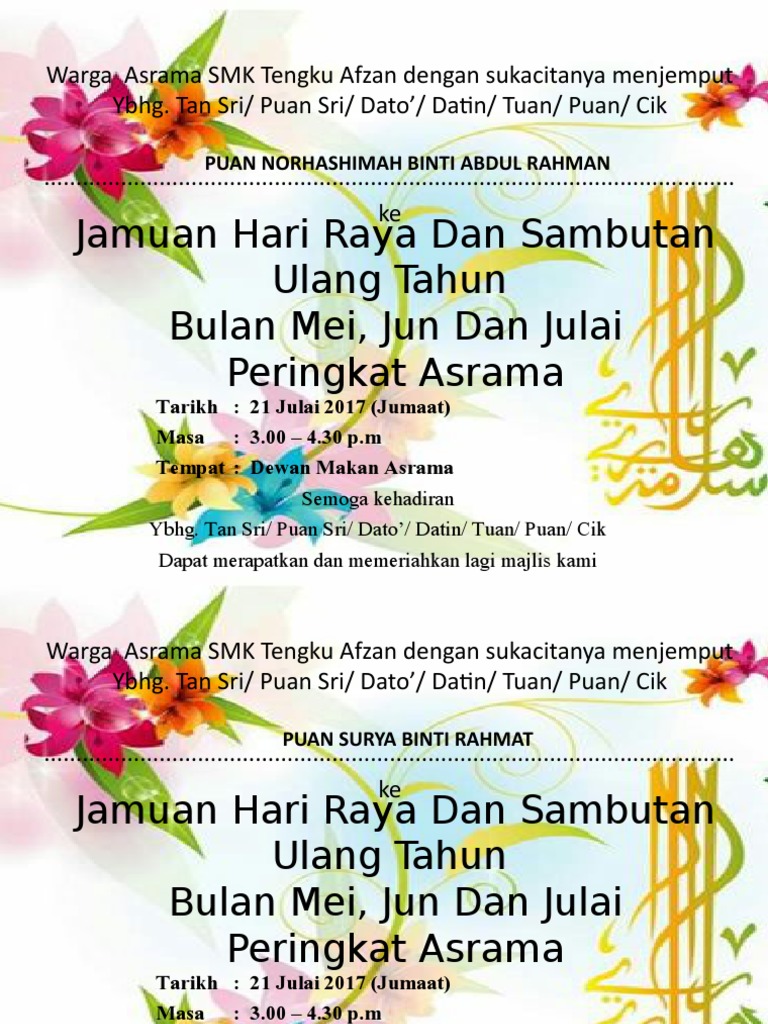 Kad Jemputan 2 Smu A Mardziah Tumpat from sabkmardziahkbgbtg.files.wordpress.com Selamat hari aidilfitri maaf zahir. Kad jemputan ibu / bapa / tetamu graduan sesi pagi. Seri samudera 2011 pada 24 september 2011 ( sabtu ) , jam 1.30 petang di kantin smk. Majlis jamuan makan malam silatulrahim. Sajian aneka makanan sempena sambutan hari raya. Hari raya dalam agama hindu. Jemputan ke jamuan hari raya aidiladha peringkat sekolah. Kad jemputan hari raya joy studio design gallery best design.