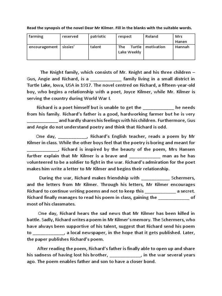 Important events dear mr kilmerfull description. Thank you everyone for making this video a reality.not a good one but hope you'll enjoy it and get some input from it.goodluck spm. The novel that i read was 'dear mr kilmer' by anne schraff. Richard wrote a letter to famous. Blanche's uncle steve is in the army,and he is liable to be fighting the germans soon. Read 16 reviews from the world's largest community for readers. At the end of the story, richard's father finally supported his passion in writing poetry. In the novel, dear mr.kilmer, the story highlights some moral values such as family responsibility, mutual understanding, love and patriotism. The novel dear mr.kilmer highlights the importance of being brave and has the courage to do in what we believe in although we might face many obstacles. In the novel dear mr. Dear mr kilmer, i think what it means to be a poet is to express feelings not just my own, but the feelings of everyone. Email google classroom facebook whatsapp twitter reddit. Let us know what's wrong with this preview of dear mr.